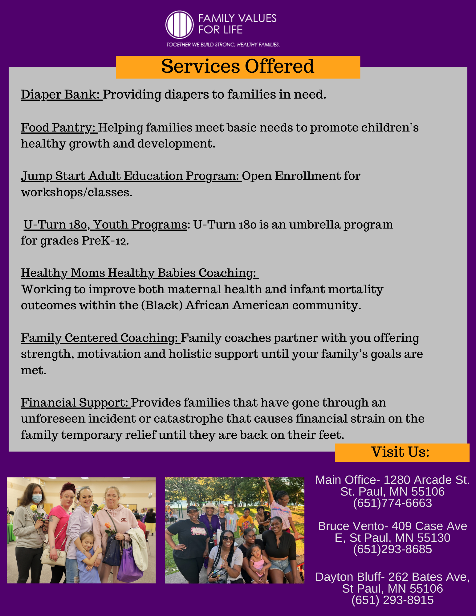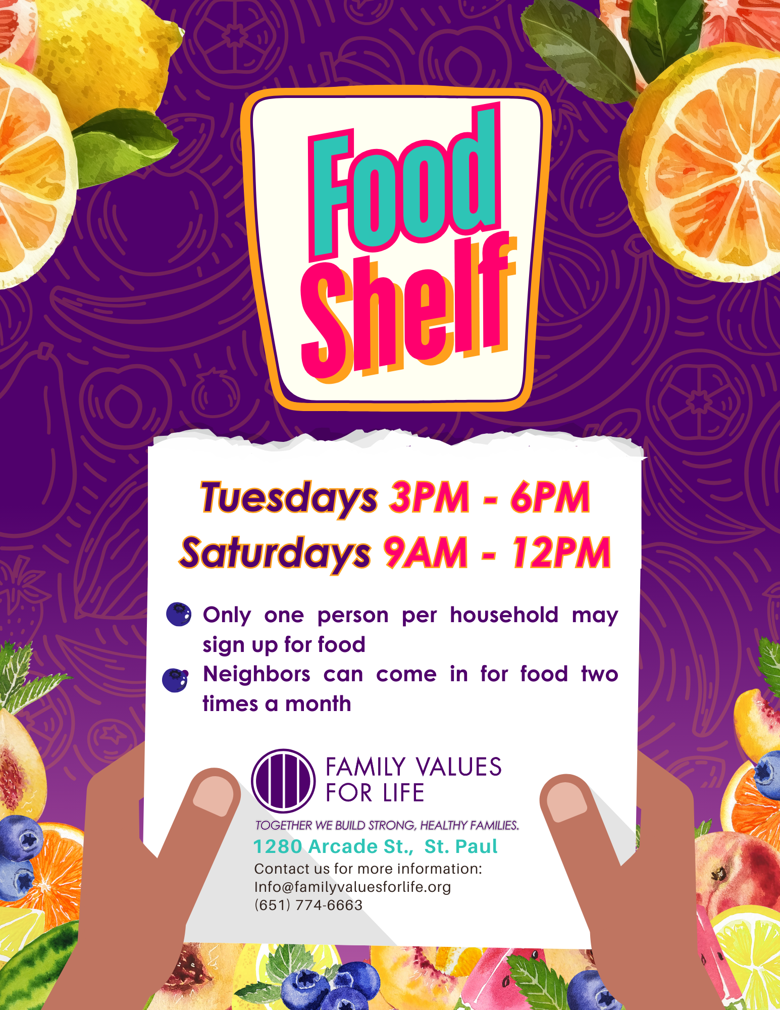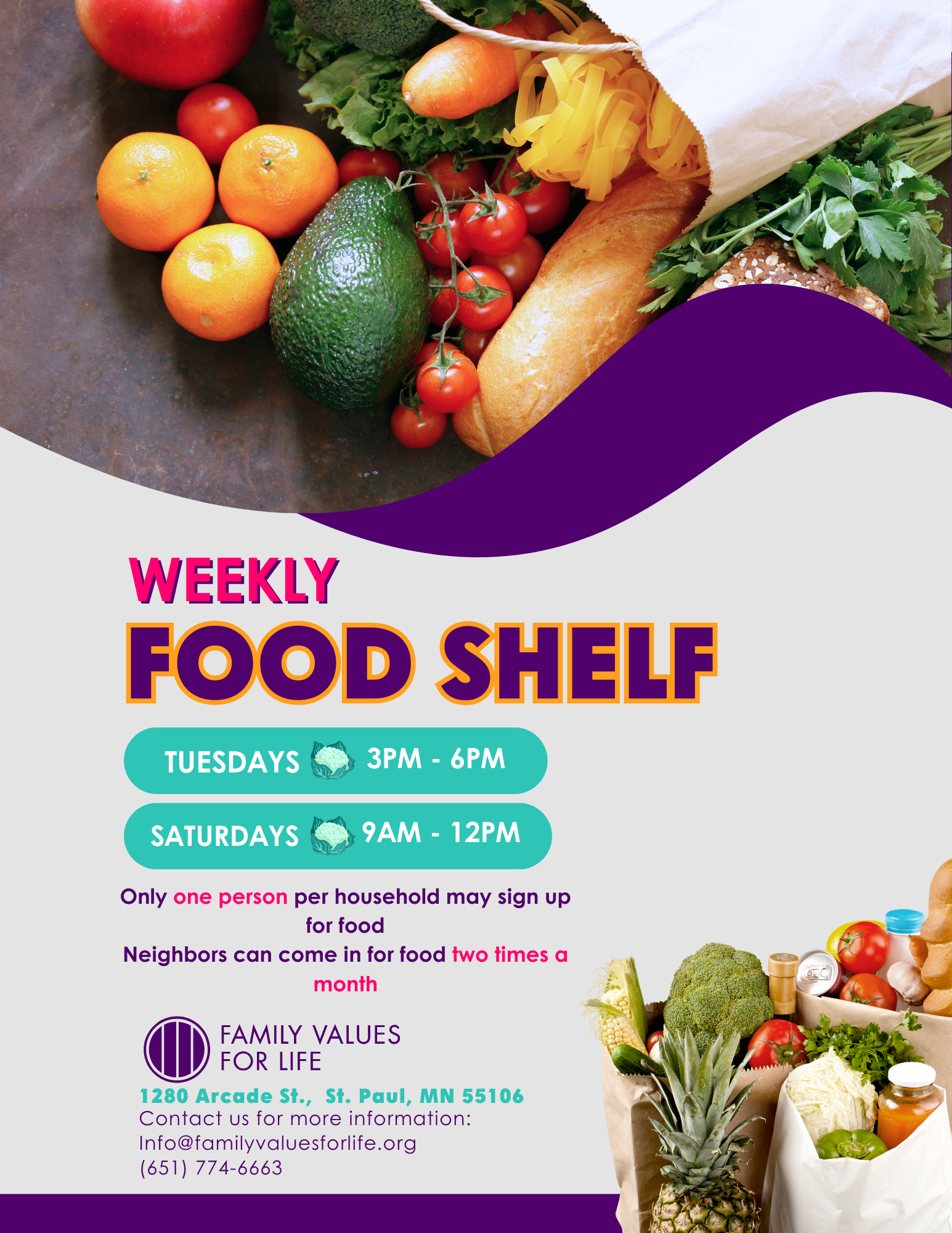 Come join our Food Shelf! Tuesdays 3PM-6PM Saturdays 9AM-12PM One member per household is eligible to visit twice per month. Please Email info@familyvaluesforlife.org if you have any questions.